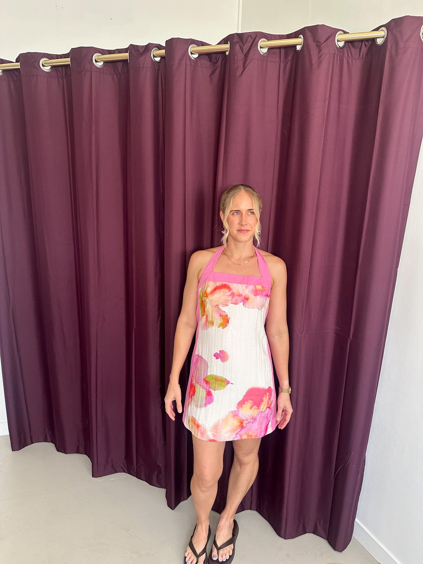 - Bright floral print, flattering design