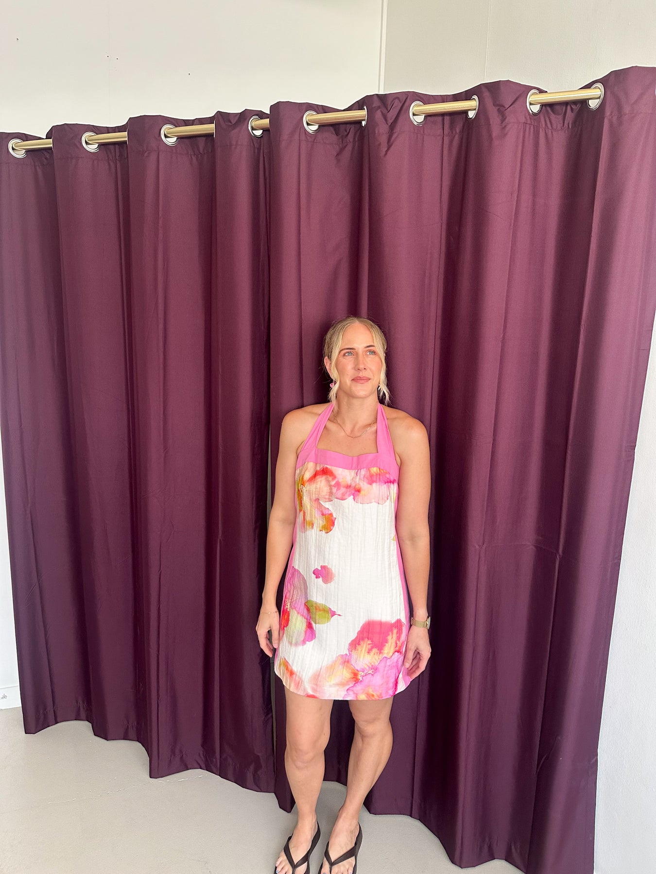 - Halter neckline and fun pink panelling on the side